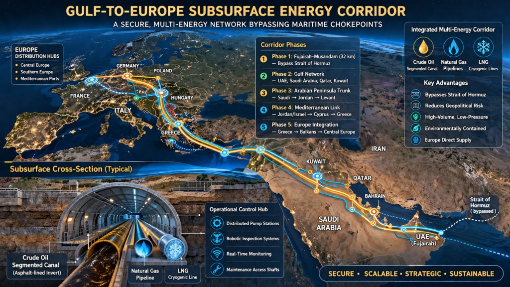 The SHOT system proposes a segmented, subterranean oil canal integrated within a broader multi-energy transport corridor. Designed to bypass the Strait of Hormuz, the system enables secure, high-volume movement of crude oil while simultaneously supporting natural gas and LNG transport within a single underground excavation.